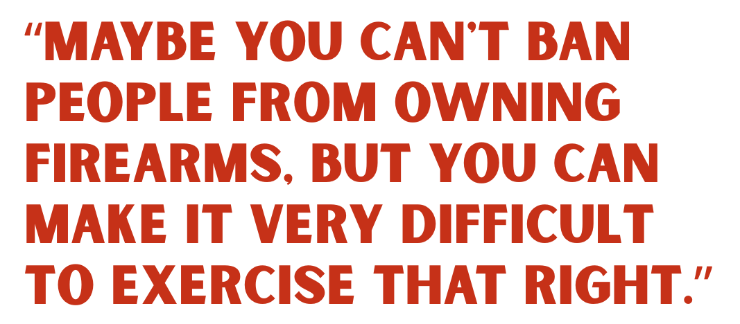California, which used to be an “Appleseed stronghold,” Kehoe says, is one such state. “Over the years, there have been so many restrictions on who could own firearms and who can use firearms in California that a lot of people have shied away from either owning them or being public about it — and, frankly, that's part of the reason they passed all of those regulations,” he says. “Maybe you can't ban people from owning firearms, but you can make it very difficult to exercise that right.”