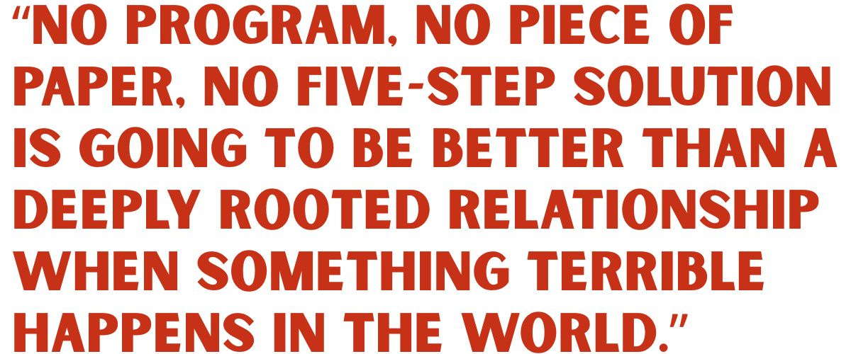 “No program, no piece of paper, no five-step solution is going to be better than a deeply rooted relationship when something terrible happens in the world,” she says.