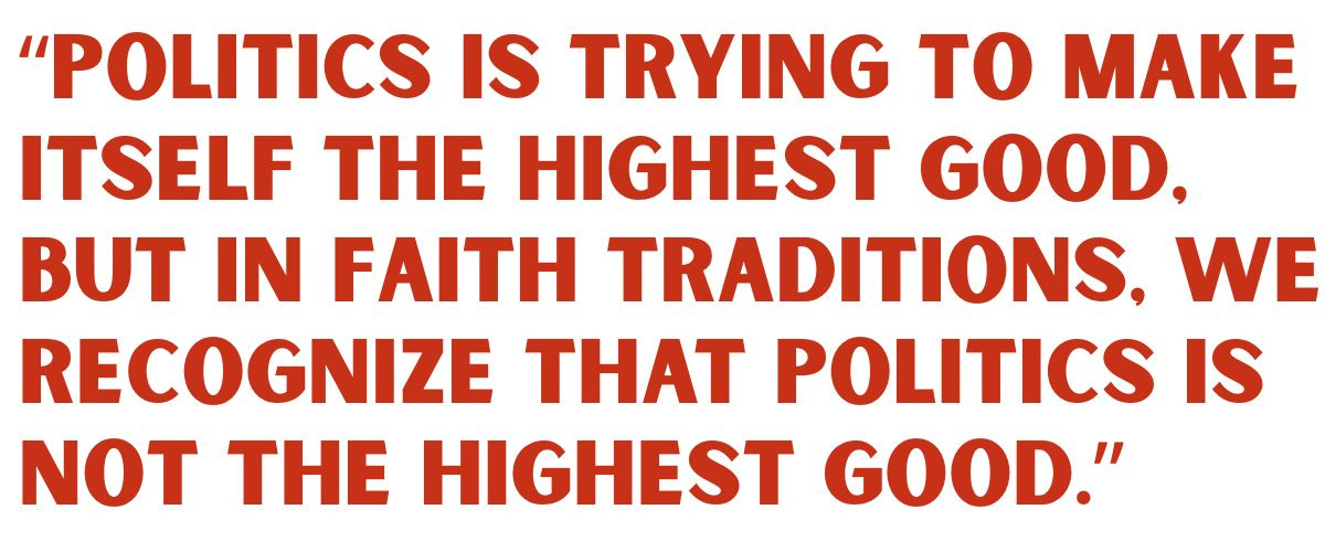“One thing we hear again and again from the faith leaders we work with is things like, ‘I have my congregation for an hour a week, and they are being’ — to use a Christian term — ‘discipled by cable news the rest of the time,’” she adds. “Politics is trying to make itself the highest good, but in faith traditions, we recognize that politics is not the highest good. That releases some of the pressure for us to be perfect and, instead, really lean on the highest good, which is God.”